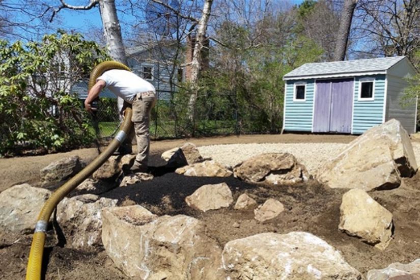 Olofson Landworks provides NH bark mulch installation via a bark blower. A bark blower is a machine used to convey bark mulch through a hose to your garden beds without the use of wheel barrows or pitchforks. This process is extremely efficient and provides a better looking finish than the old hand raking.
