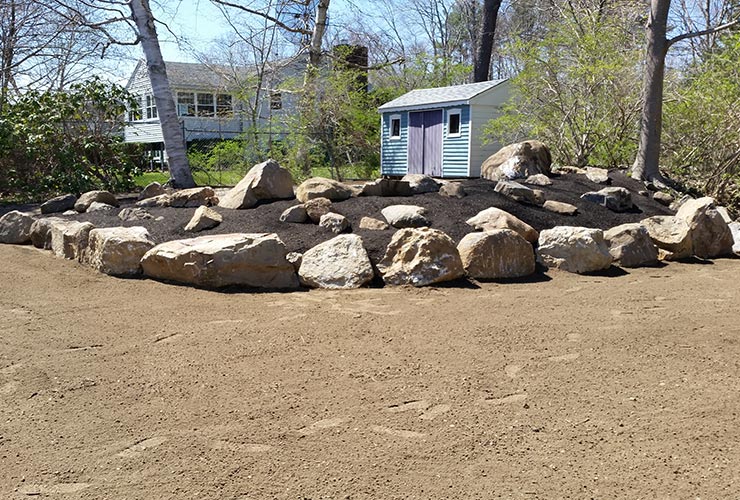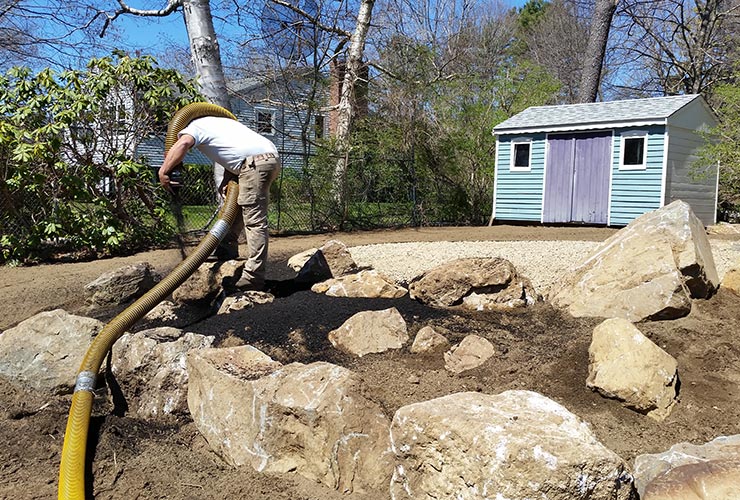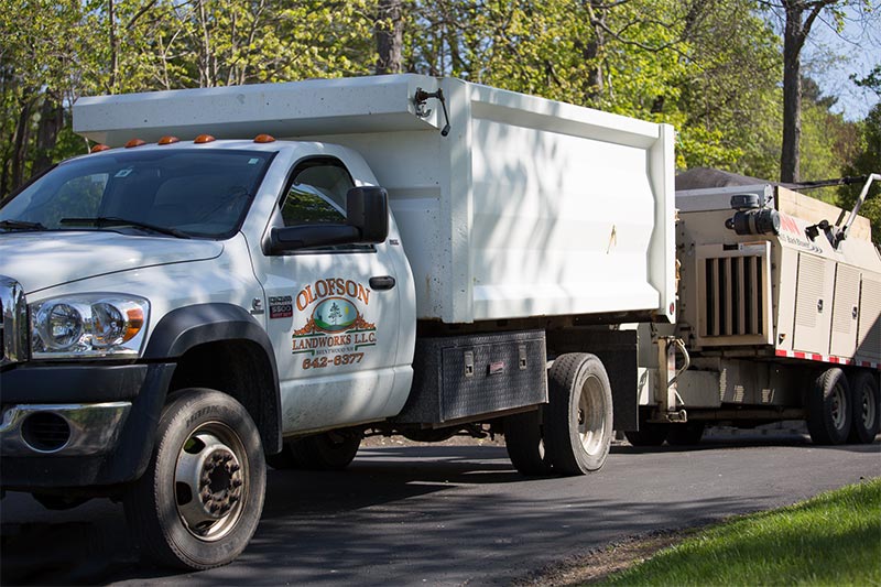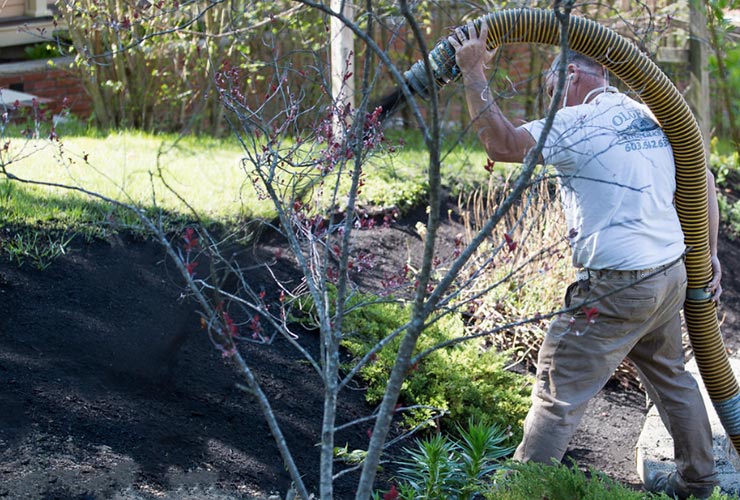 Olofson Landworks provides NH bark mulch installation via a bark blower. A bark blower is a machine used to convey bark mulch through a hose to your garden beds without the use of wheel barrels or pitchforks. This process is extremely efficient and provides a better looking finish than that of hand raking.